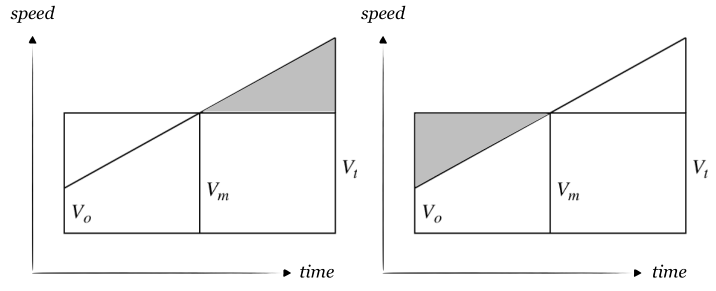 In the 14th century, a group called the Oxford Calculators made the first theoretical progress. First, they made the audacious assumption that motion was possible. Then, using the medieval version of a PowerPoint slide, they showed that if you accelerated uniformly from rest, you would go exactly as far as if you had gone half the final speed for the same amount of time.